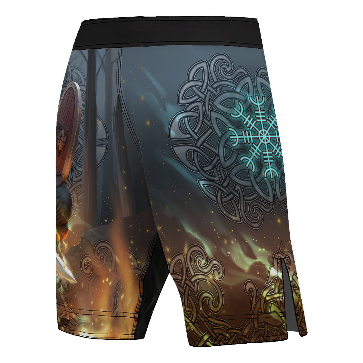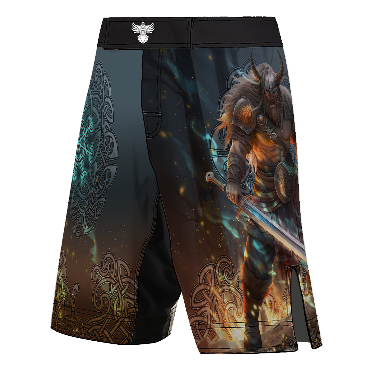 Step onto the battlefield with the Einherjar Men's Fight Shorts. Featuring a detailed Viking warrior surrounded by Nordic knotwork and elemental fire, these shorts are made for the modern-day warrior.