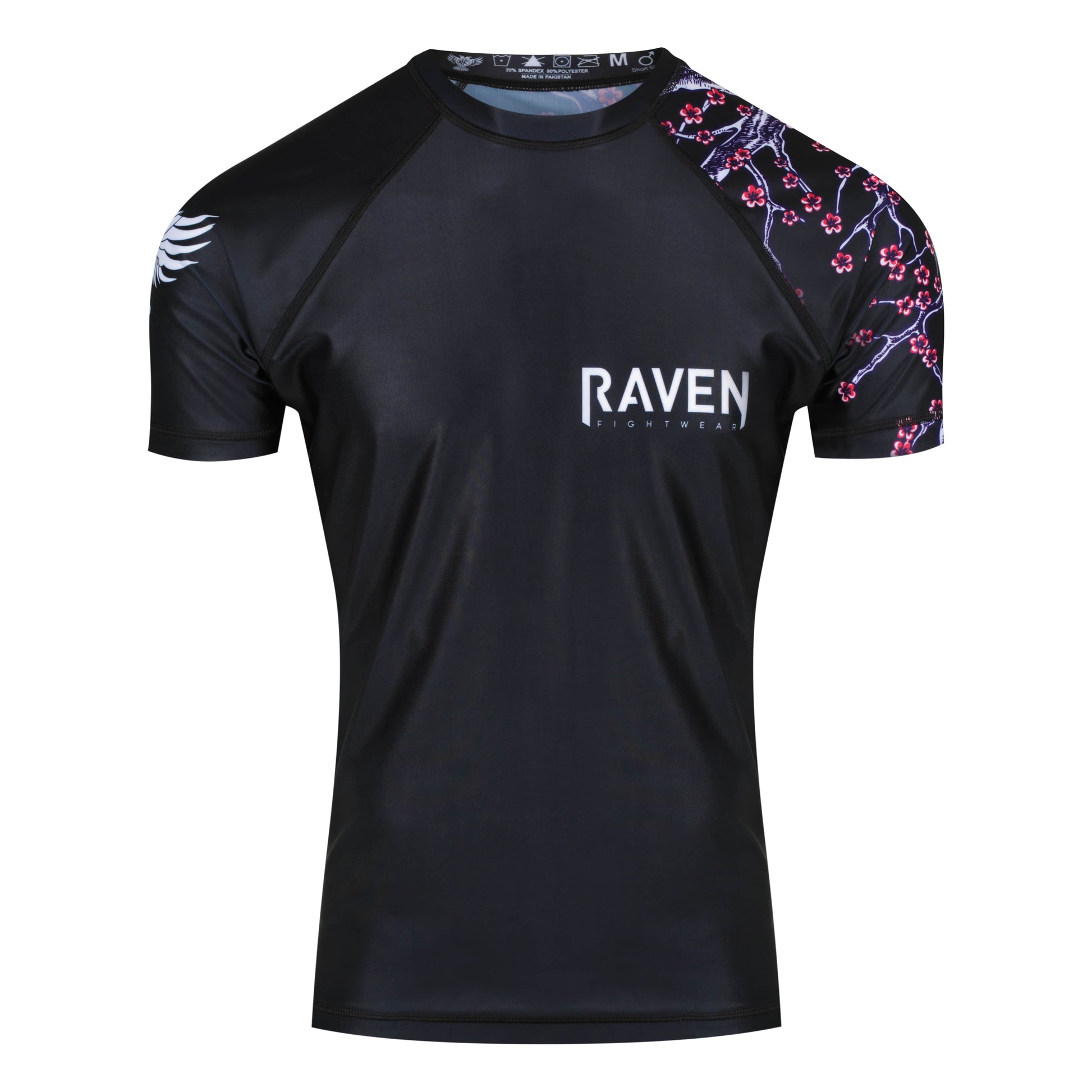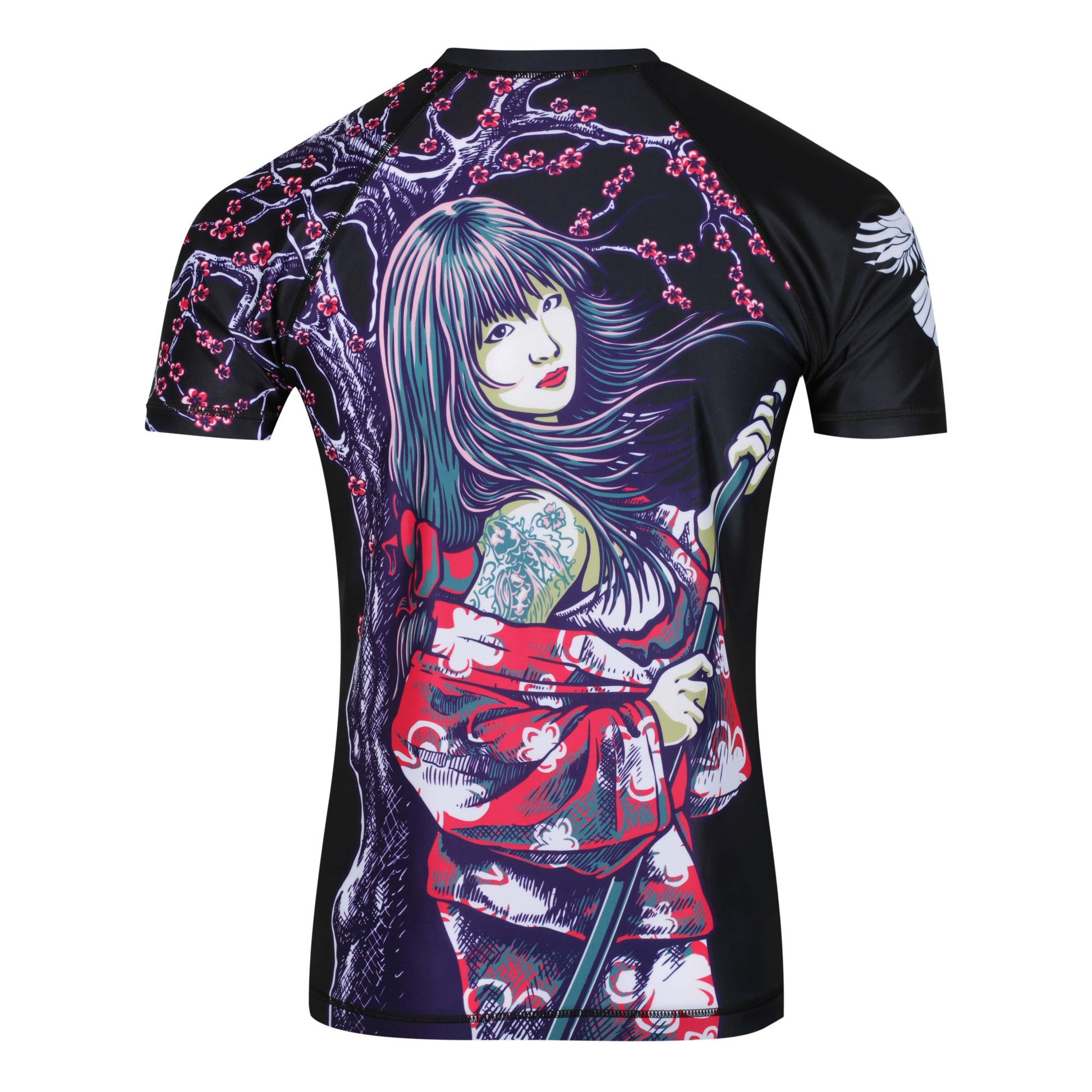 Grace and danger blend in the Sakura Men's Short Sleeve Rashguard from Raven Fightwear. Featuring a stunning, tattooed woman in a traditional kimono poised with a katana under cherry blossoms, this design is both elegant and fierce. The left shoulder and back explode with bold Japanese-inspired art, while the front maintains a minimal look with a clean Raven logo and subtle sakura patterns on the right shoulder. This piece is a tribute to beauty, strength, and the warrior spirit.