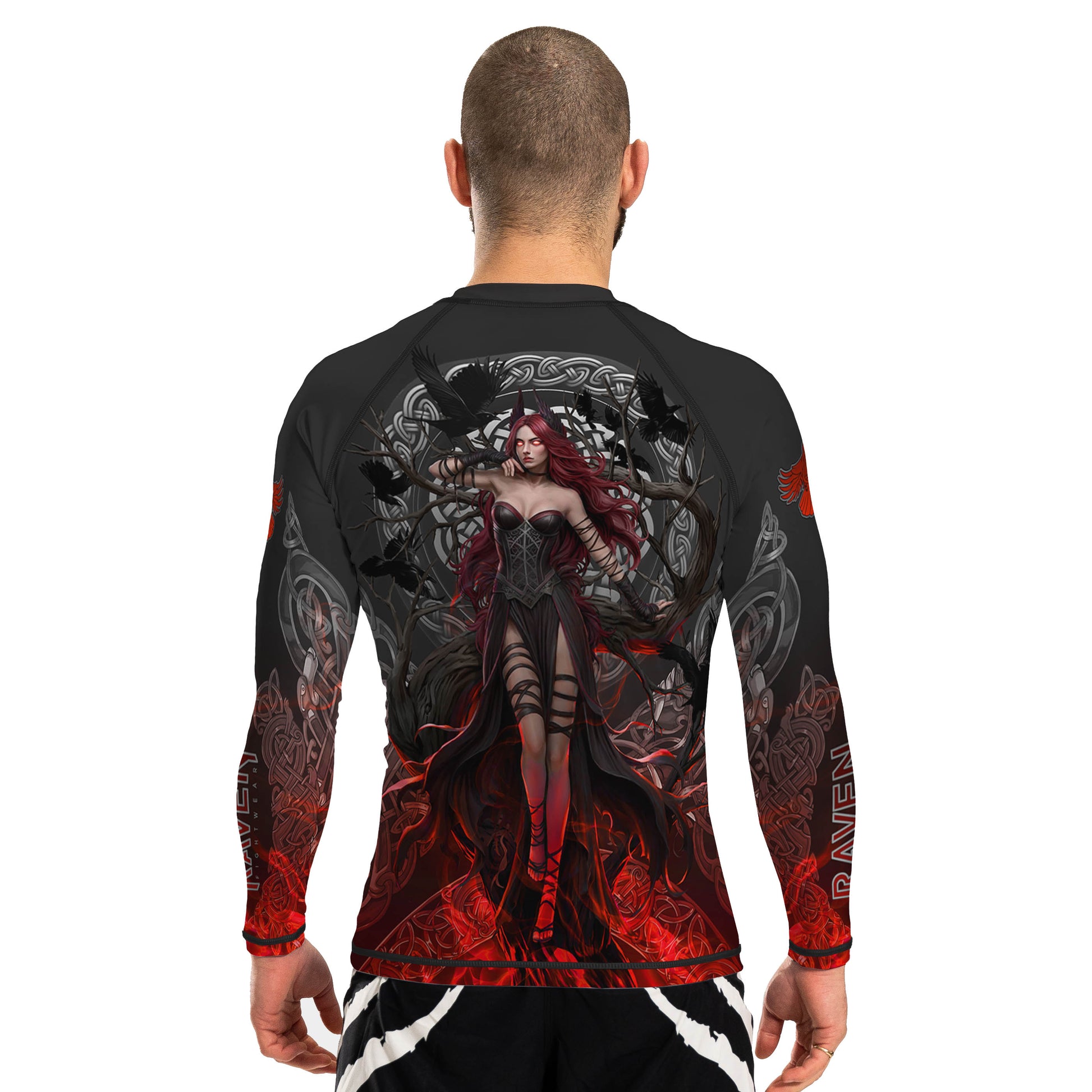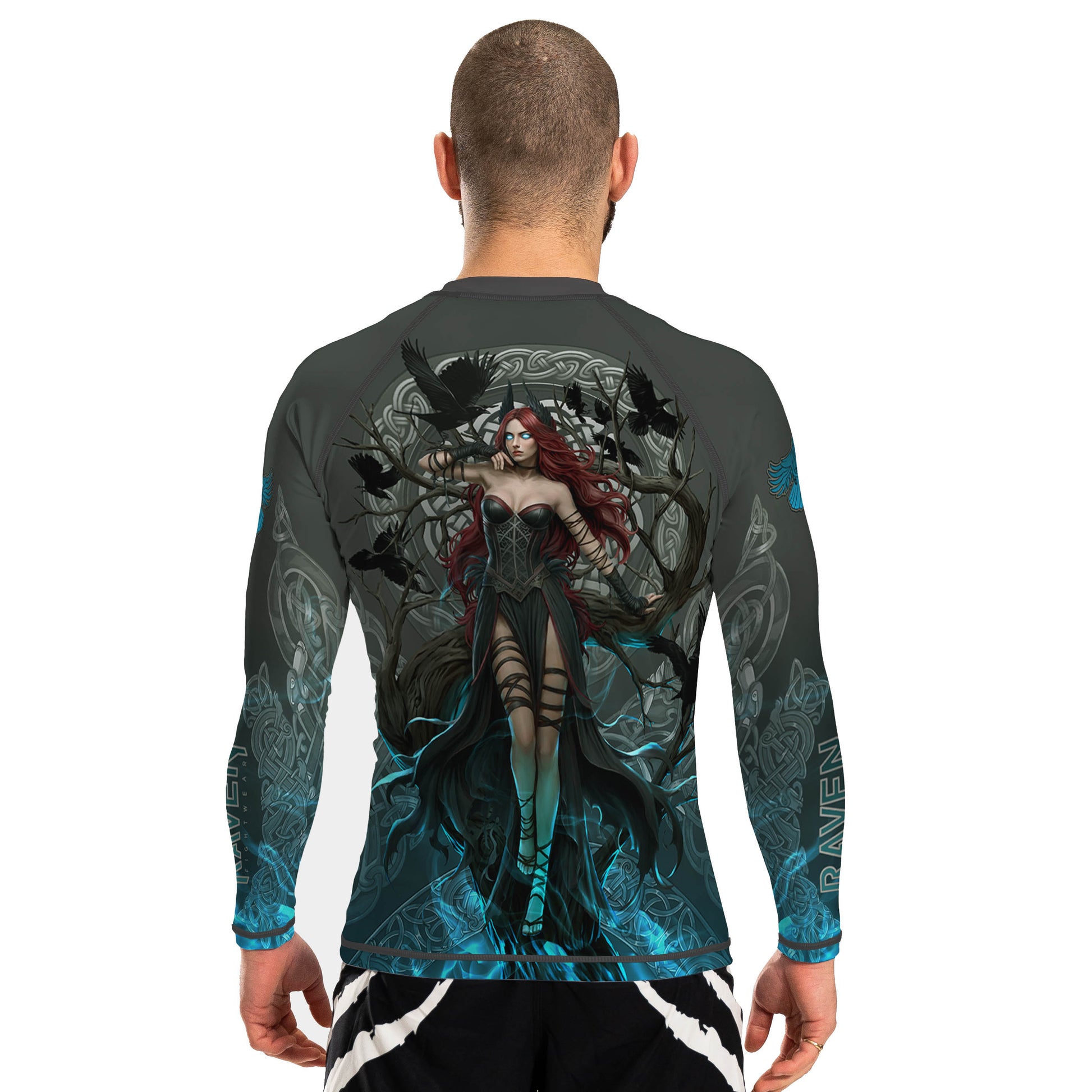 Dominate the mats with myth at your back. This long sleeve rashguard is inspired by The Morrigan — the Celtic goddess of war, fate, and death. Known for taking the form of a crow, she circled above battlefields to decide who lived and who fell.