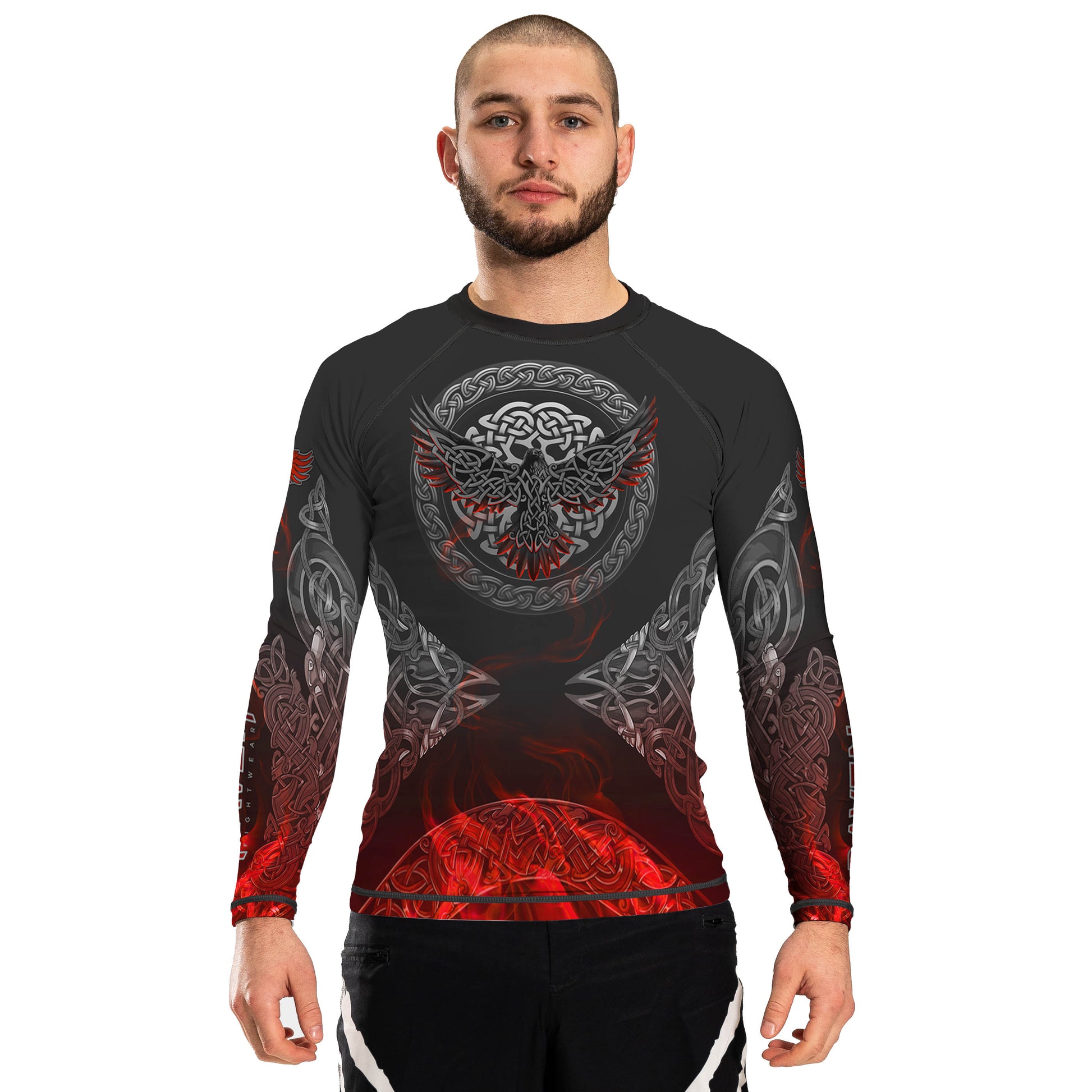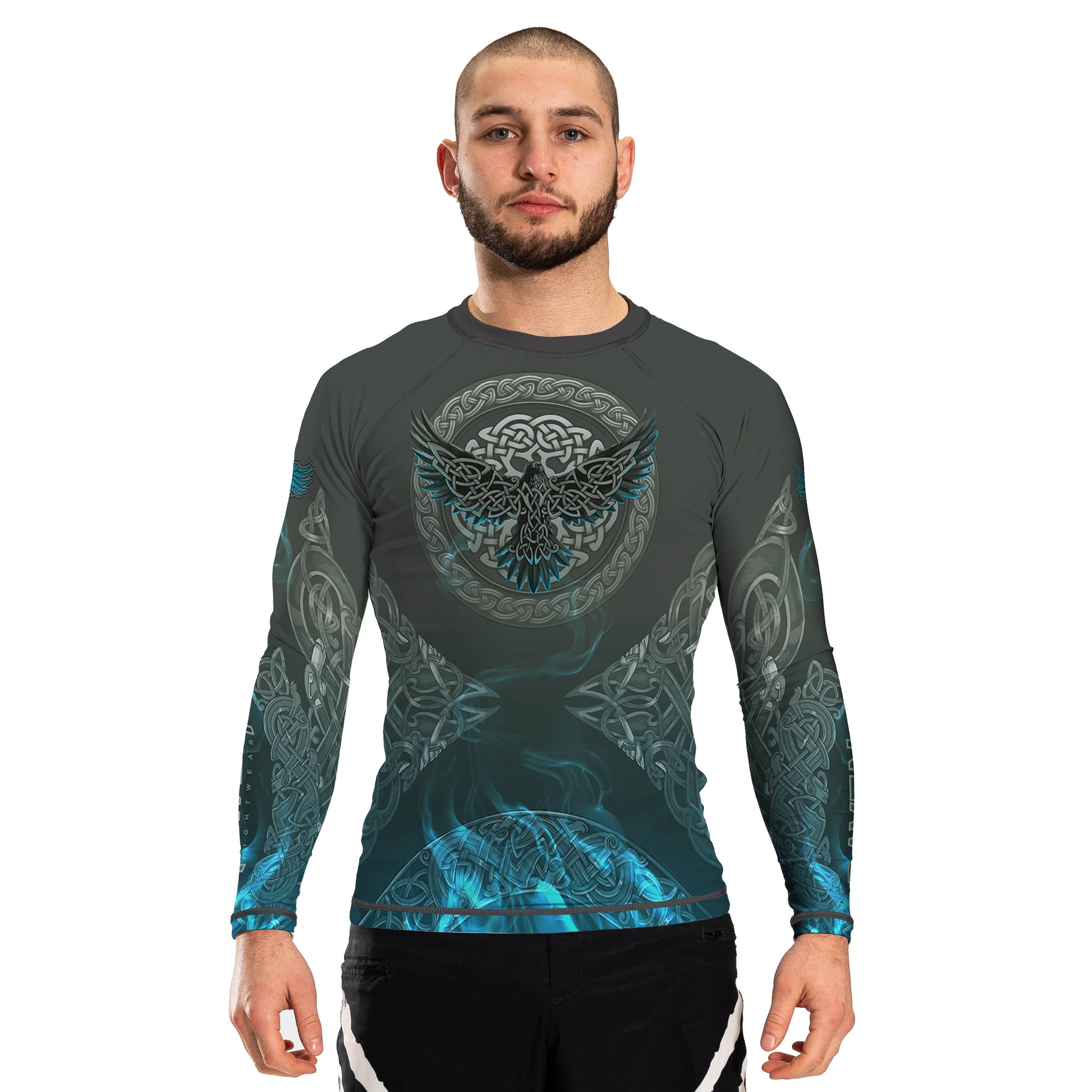 Wrapped in Celtic knotwork and surrounded by ravens, this long sleeve rashguard comes in two distinct colorways: