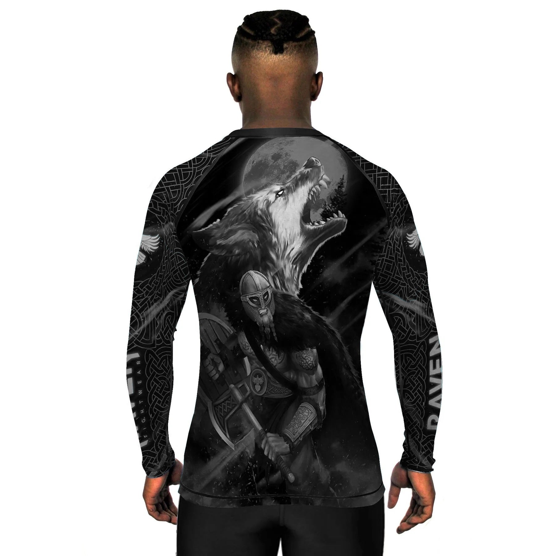 The Ulfhedinn 2.0 Monochrome rashguard channels the primal spirit of Viking warriors with a bold black-and-white design. A fearsome wolf stares from the front while a Viking berserker roars beneath a full moon on the back, honoring the legendary ulfhednar who fought with the power of the wolf. Runic symbols, Nordic patterns, and atmospheric contrast bring this design to life in striking detail.