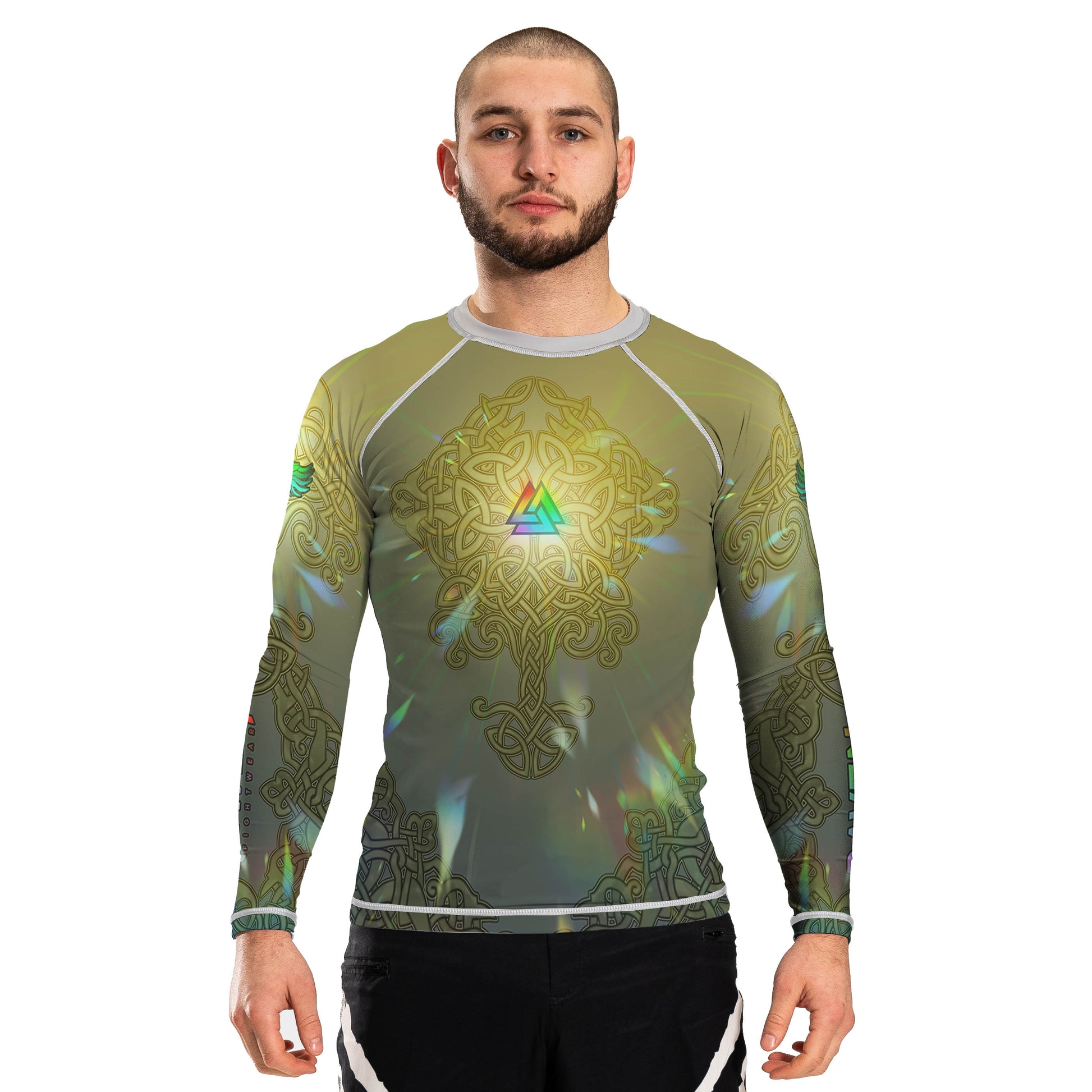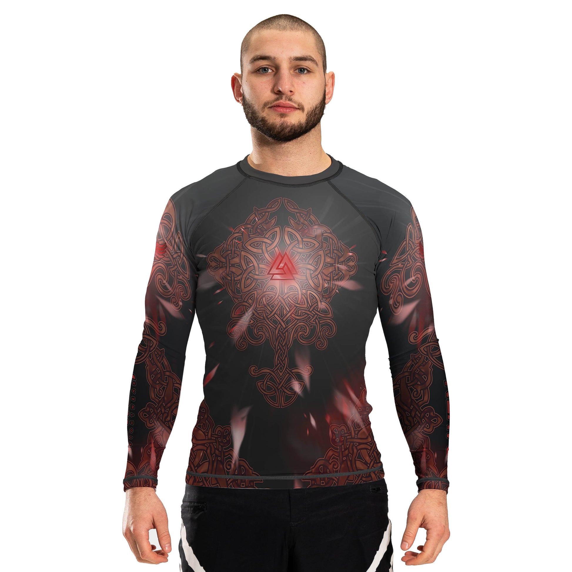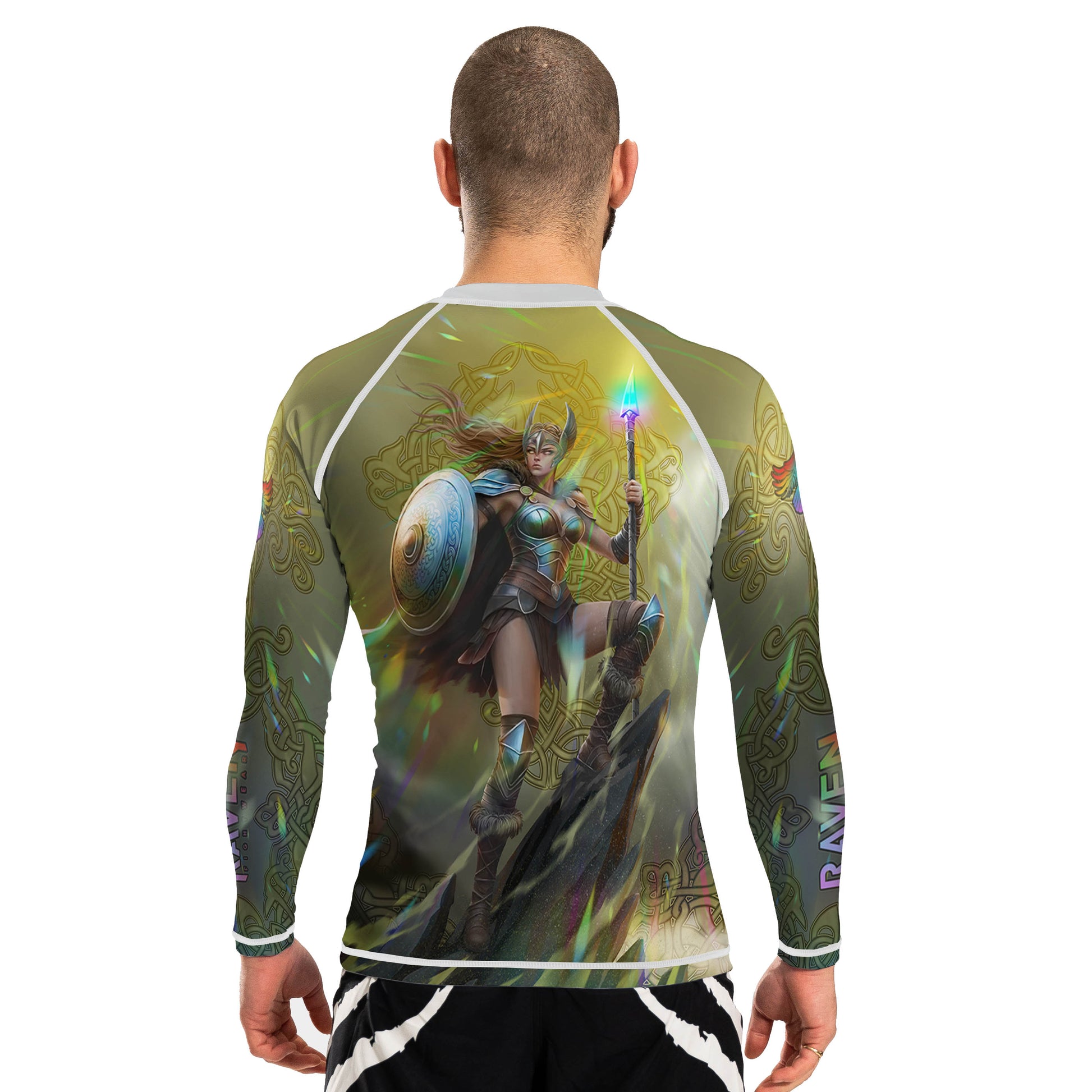 Stand like a warrior of legend in the Valkyrie Men's Long Sleeve Rashguard – a tribute to Norse mythology fused with elite performance wear. Featuring a powerful Valkyrie flanked by Celtic knotwork, this rashguard comes in two striking variants: Bifrost (radiant gold/iridescent tones) and Emberfall (dark red/black intensity).